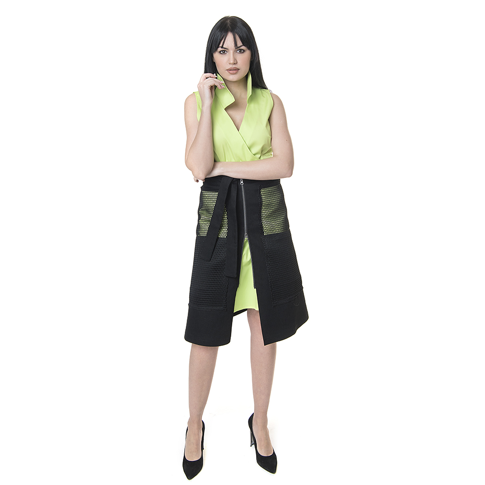 Detalii: fermoar cu dublu cursor, 2 buzunare supradimensionate ce includ 2 buzunare functionale generoase. Fusta poate fi purtata ca si fota.