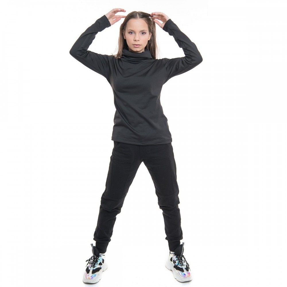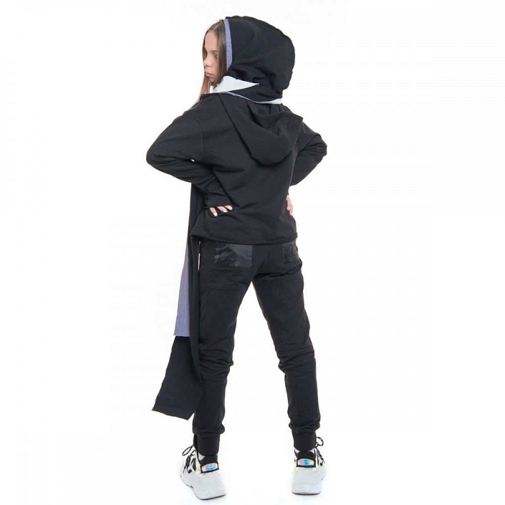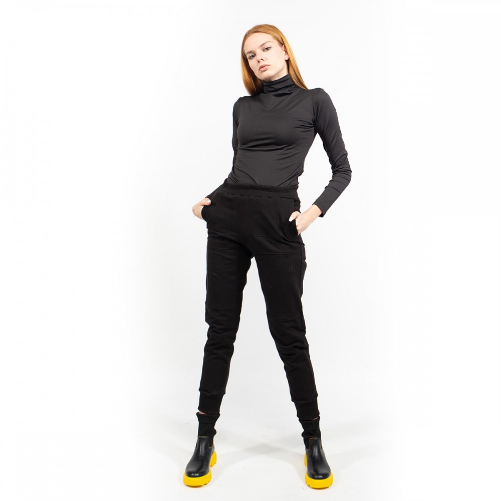 Detalii: cu talie inalta elastica, buzunare cu clapa aplicate