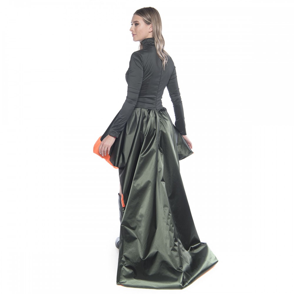 Detalii: terminatii asimetrice, guler inalt, trena supradimensionata