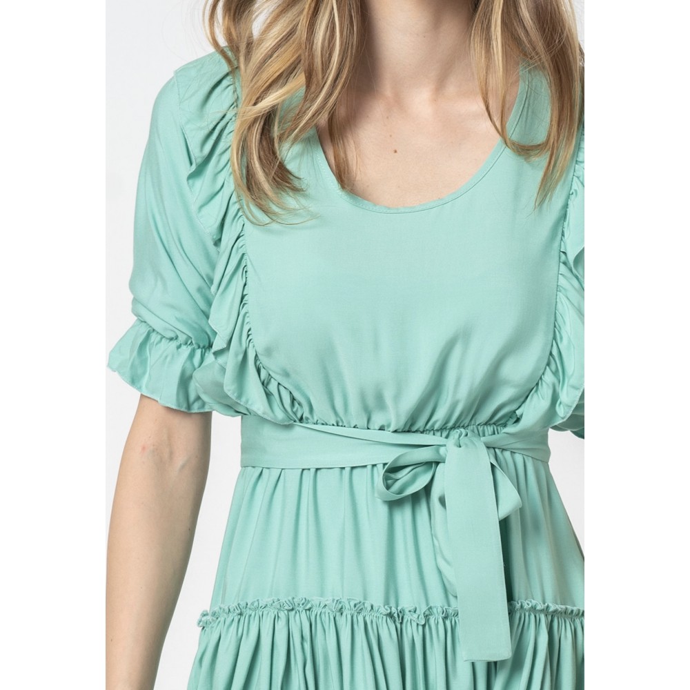 Rochia Dori cu volane are o croiala lejera și este prevăzută cu un cordon în talie.